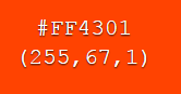 Well, from this point, all we have to do is see which value #ff4301 is closer to: orange or red. Since there red value is the same for both of these (FF, or 255), we can ignore it. The blue value is also identical for both, so that can be ignored as well. All we really have to do is compare the green values and we should be fine. So, the Reddit colour has a green value of 67. If we subtract that from orange, we have a difference of 98; if we subtract it from red, we have a difference of only 67. According to colour difference theory to find the true distance of the colours from each other we need to square these numbers. In any case, however, the difference between colours is lower for red, so one would say that the Reddit colour is closer to hex red than it is hex orange.